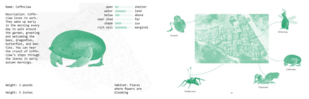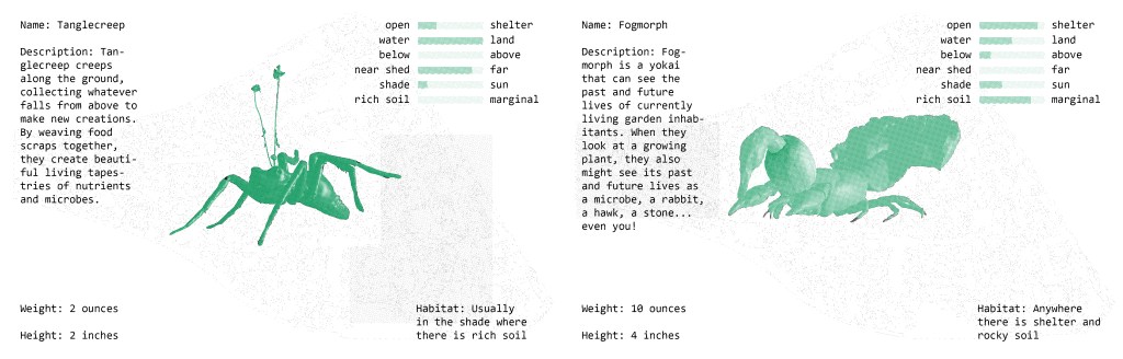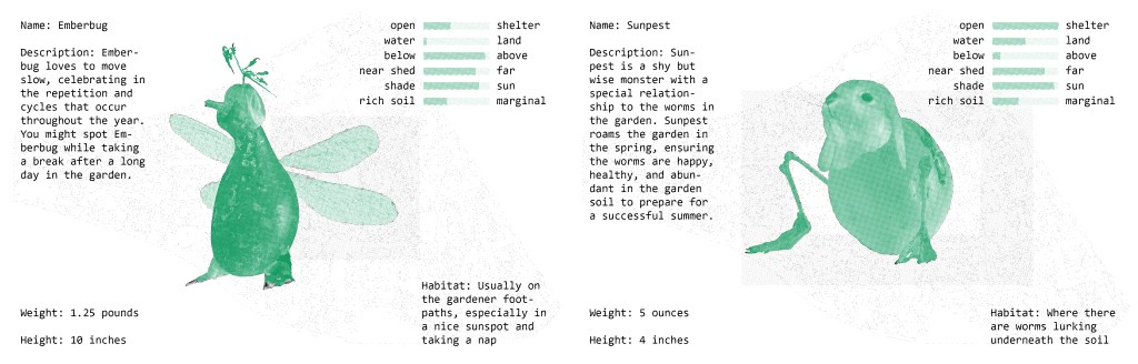 these yokai monsters were created using 3D scans of garden scraps donated from gardeners at the christian herter community garden. The monsters embody the spirit of the garden concerned with managed decomposition, and the printed totems are used in a yearly compost ritual I created after exploratory interviews about gardening and compost with CHCG gardeners. the monsters come with a short guide to the monsters’ “natural history” as a part of the kit.