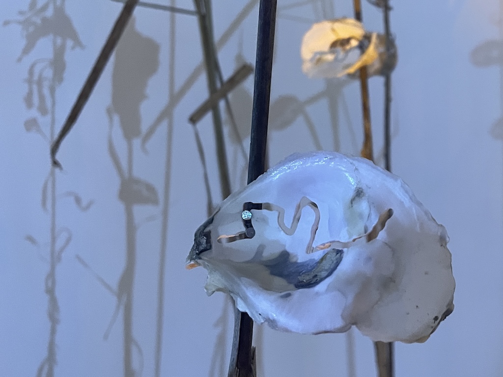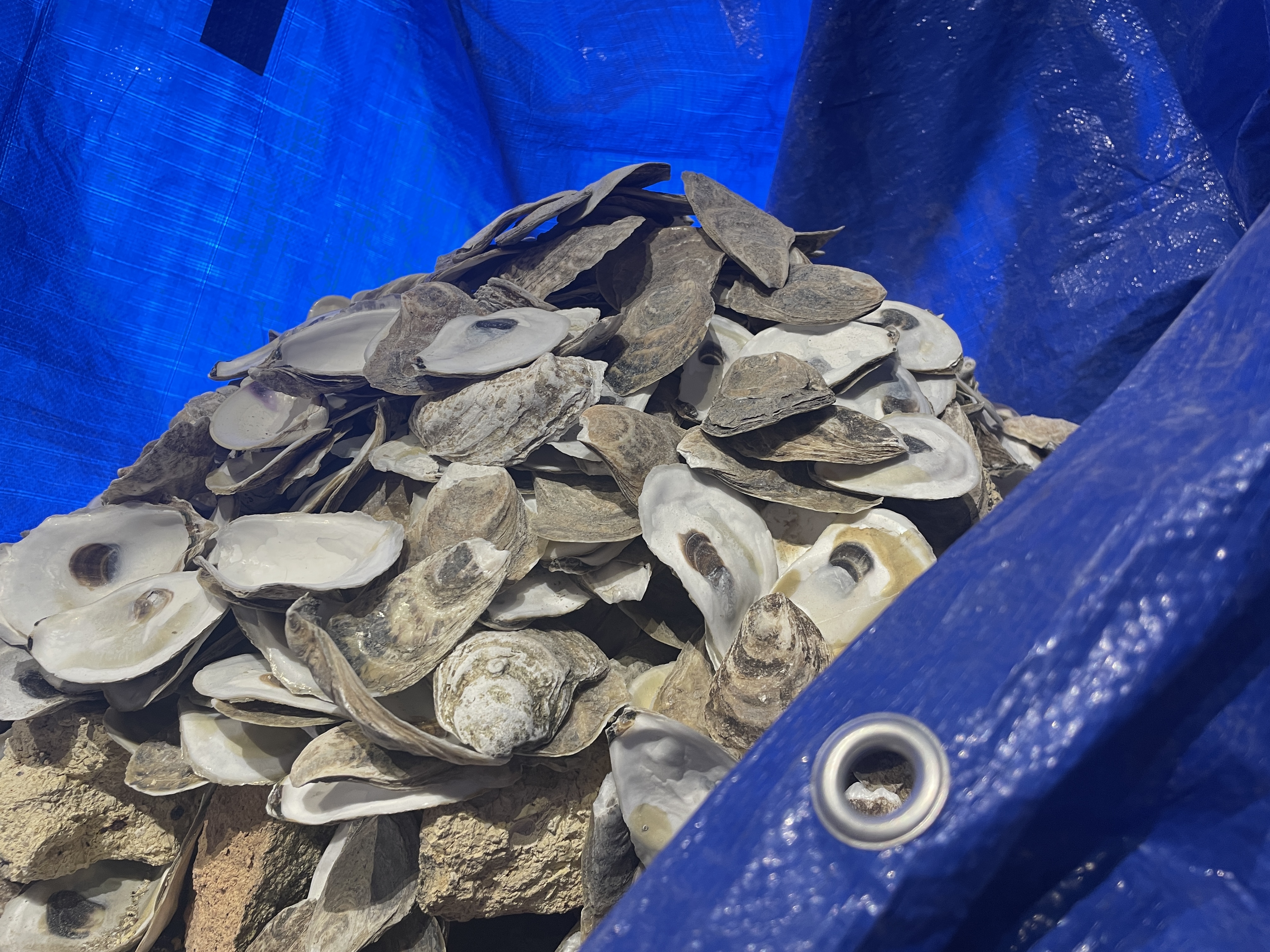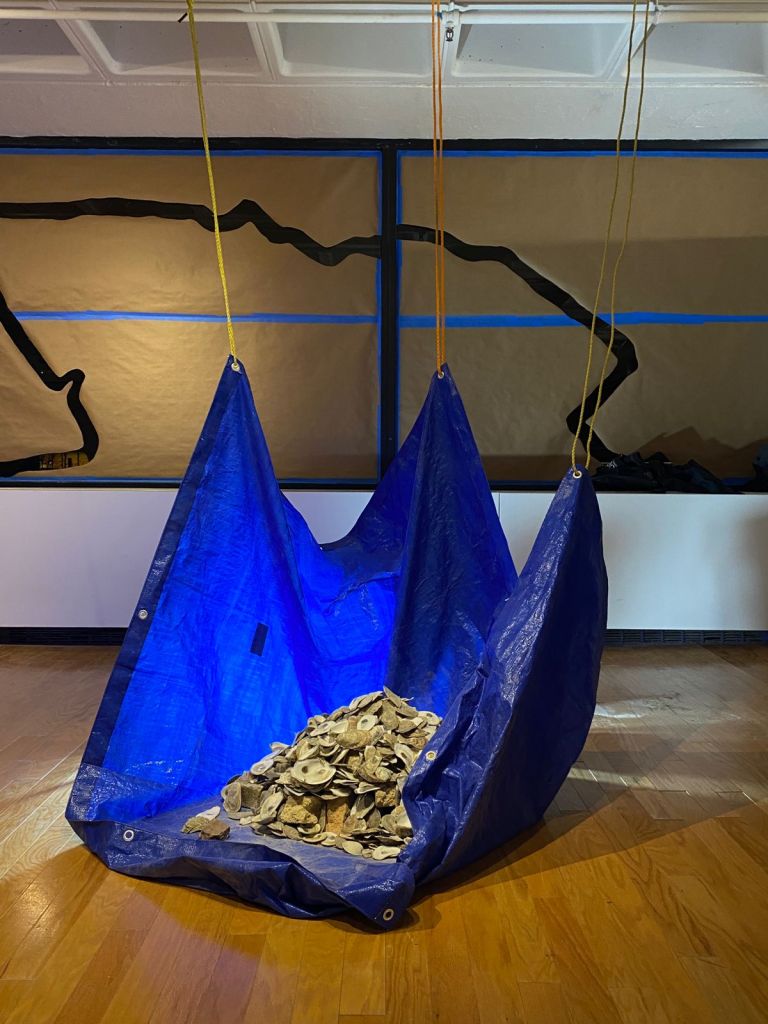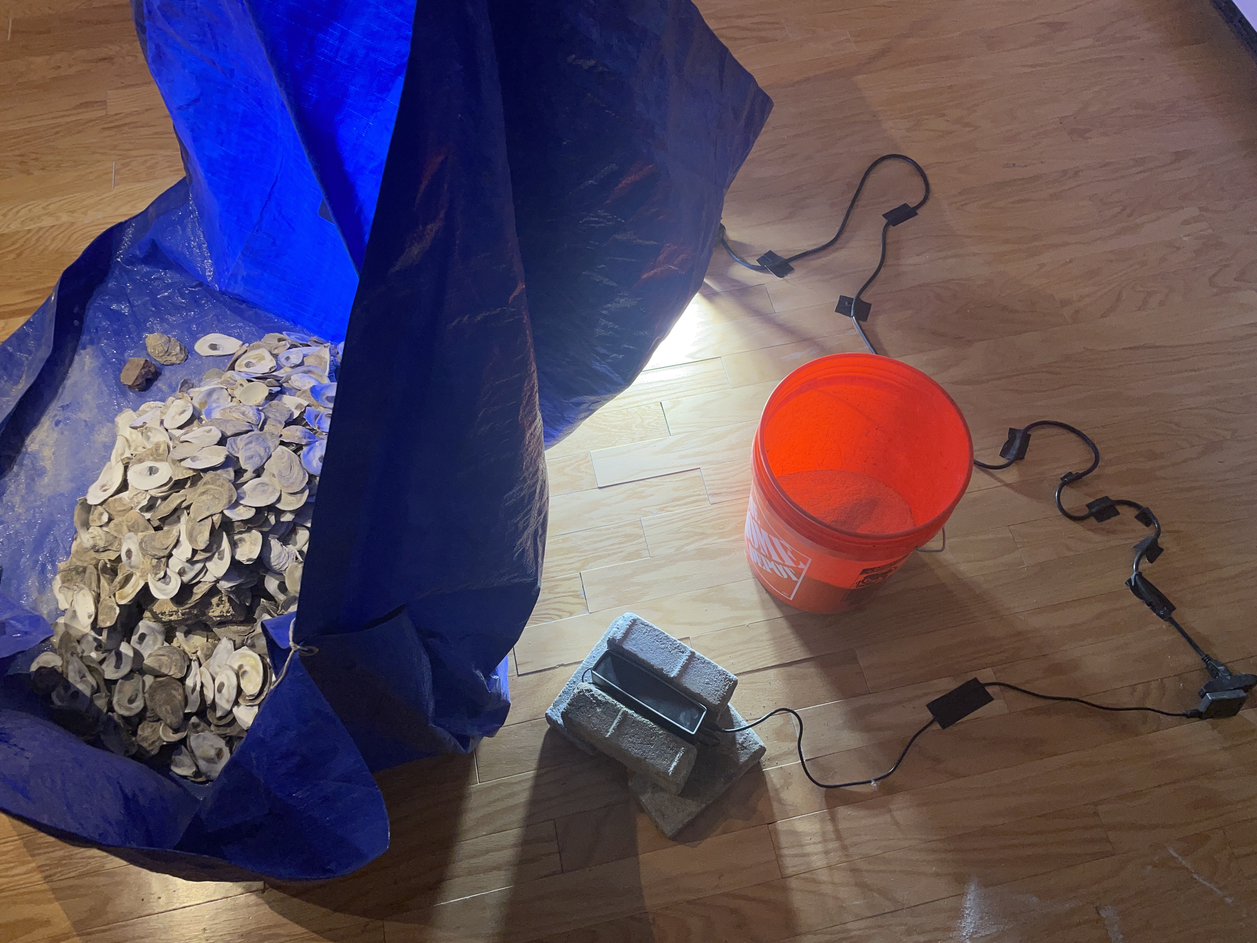 multimedia installation. cleaned oyster shells (legal seafoods), used tarp, borrowed rope, salvaged bricks, 3min looped soundscape (healthy oyster reef, marsh birds, marsh footsteps, unhealthy oyster reef, belle isle marsh atmosphere, laboratory footsteps), portable speaker, work light, bucket, oyster shell powder