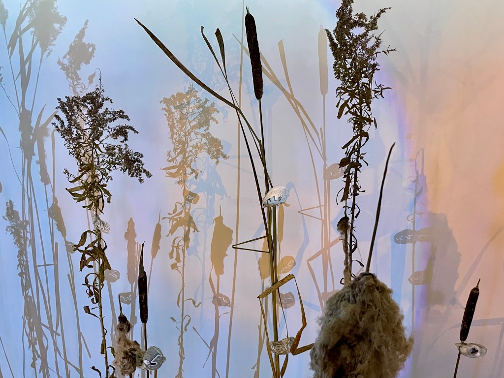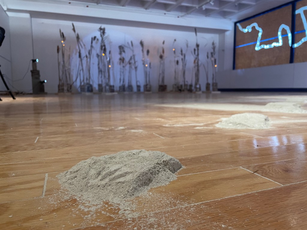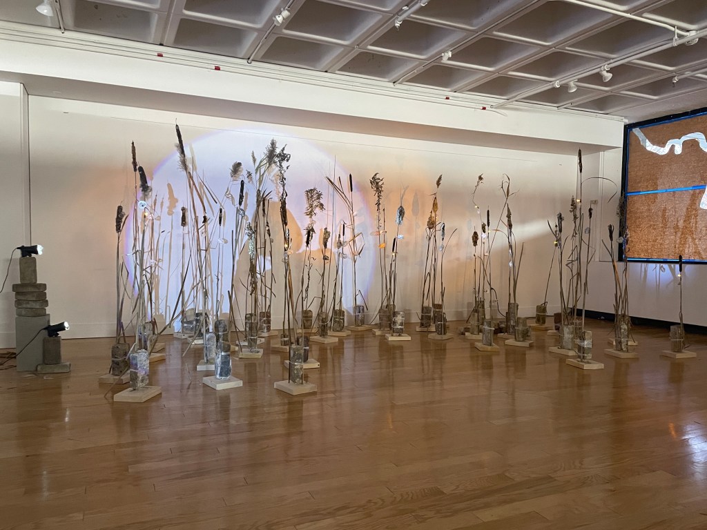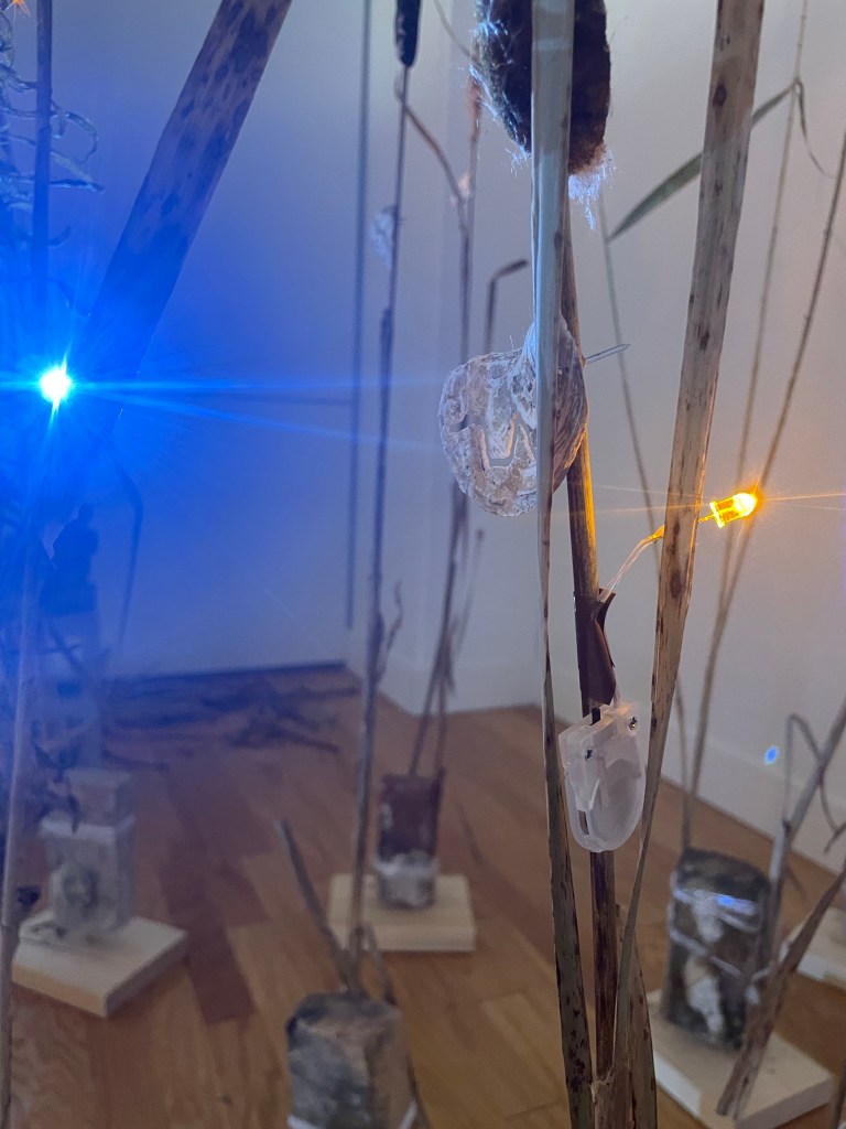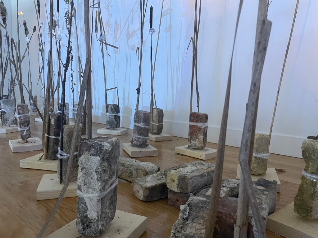 multimedia installation. cattail (typha spp.), goldenrod (solidago spp.), Common reed (phragmites australis), spruce (picea sp.) lumber, salvaged brick (malden, MA), packing plastic, oyster shells, led lights, spotlights, cinderblocks