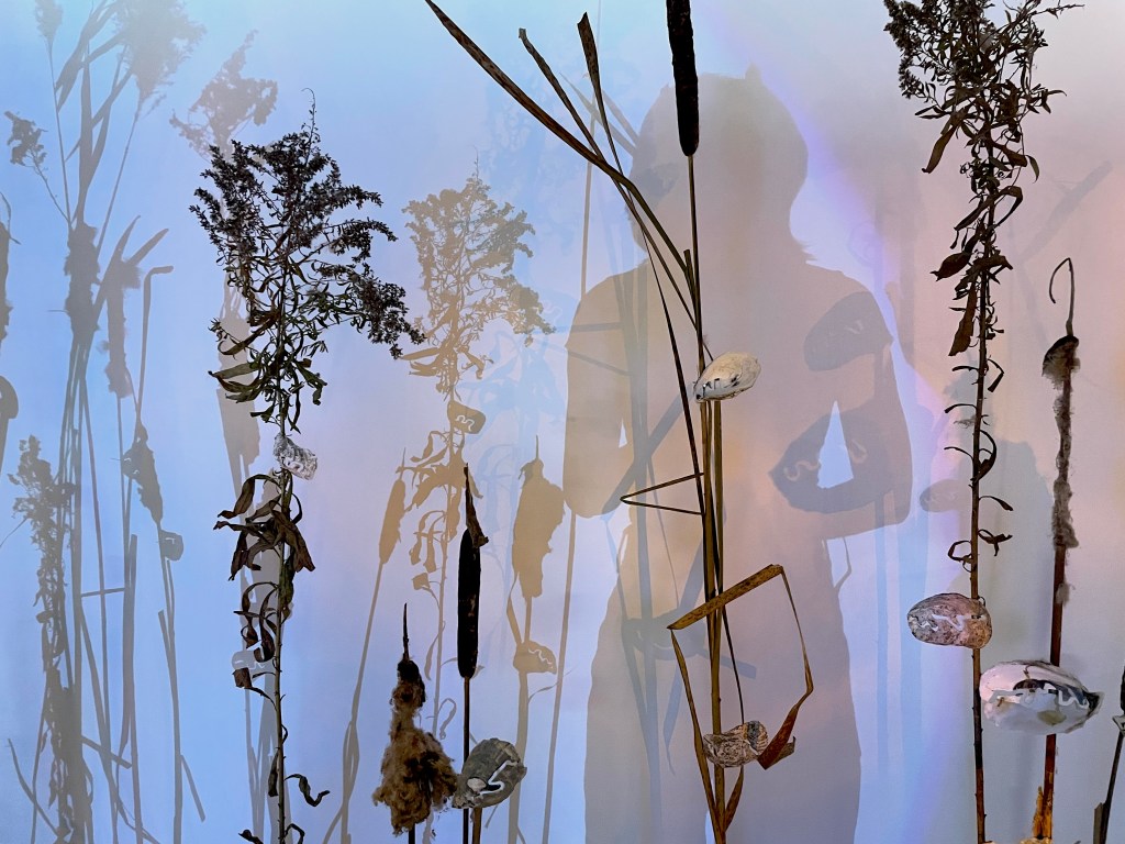 An installation combining past and present materials of a landscape with light and shadow to form an embodied, historical (instead of mathematical, ahistorical) ecological projection model.