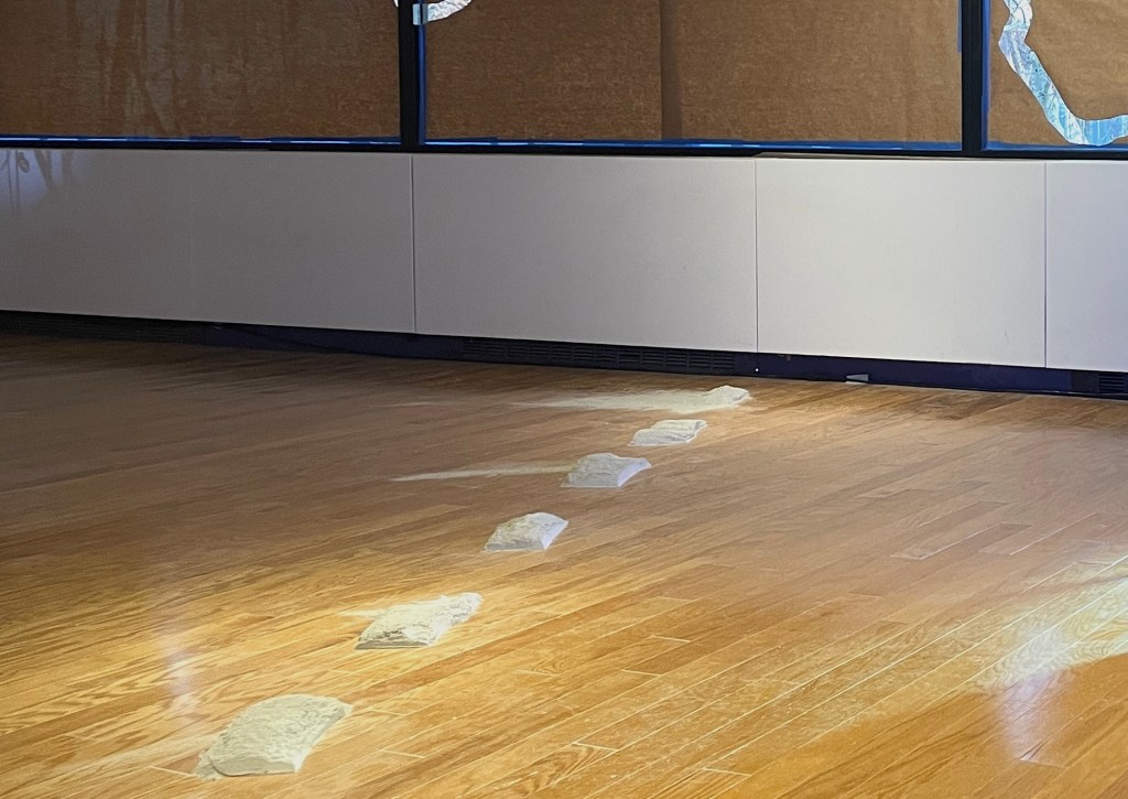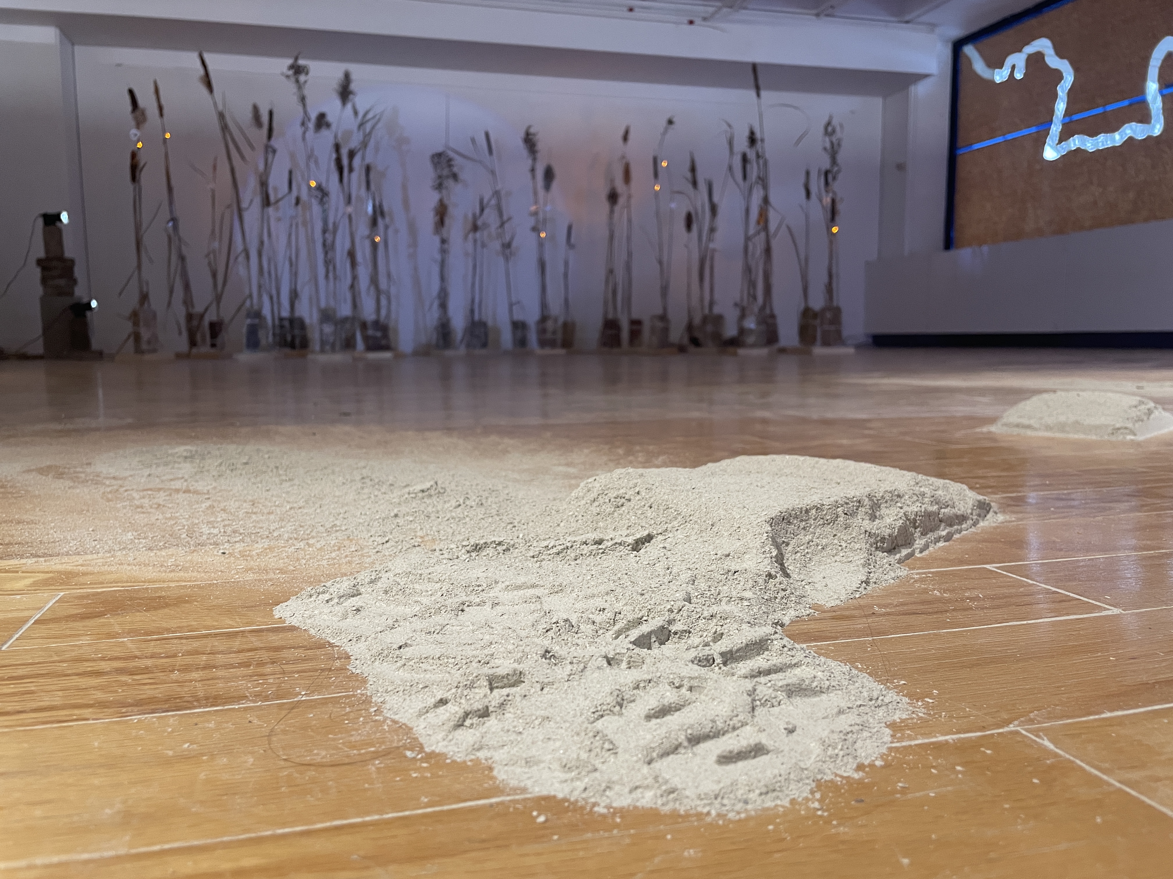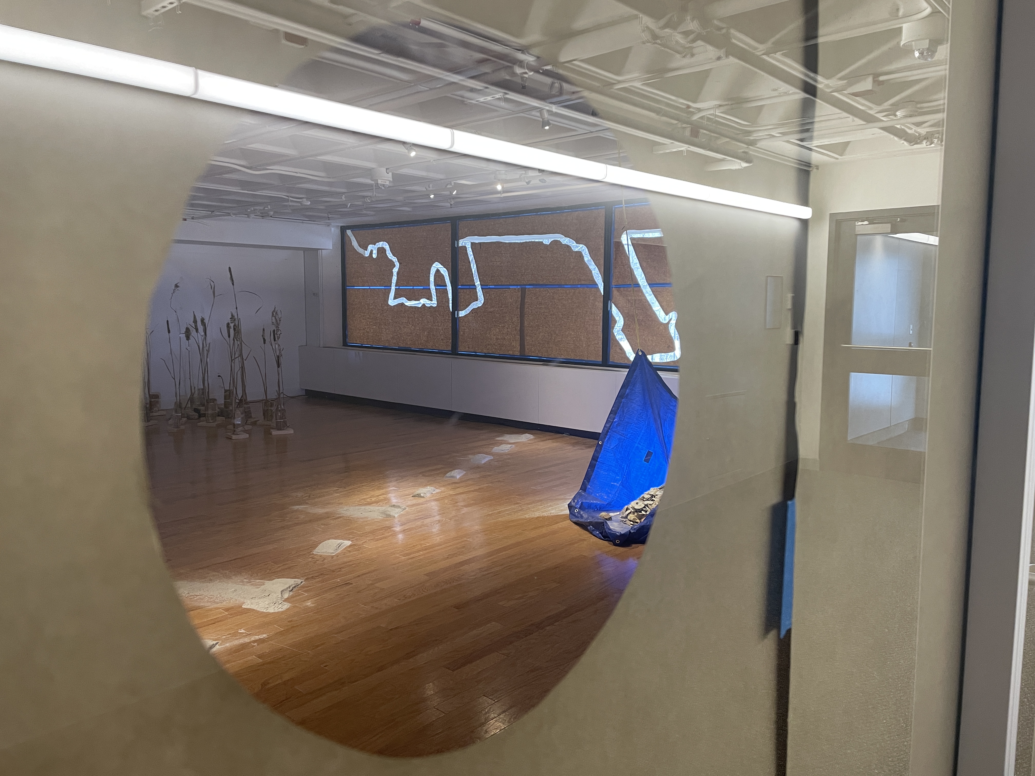 This exhibition uses the hardening of the river shoreline as a lens to make sense of MIT’s ecology (why does it feel like this?). Over a geological blip of a time period, the marshy, winding, and fluctuating river form of Quinobequin—whose shore would have run through the gallery where this work was installed—was dredged, straightened, and made static. These enormous industrializing and colonizing efforts created the Charles river as we know it today.