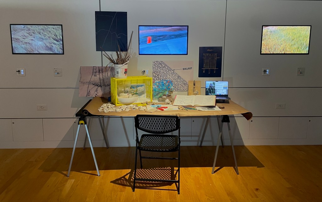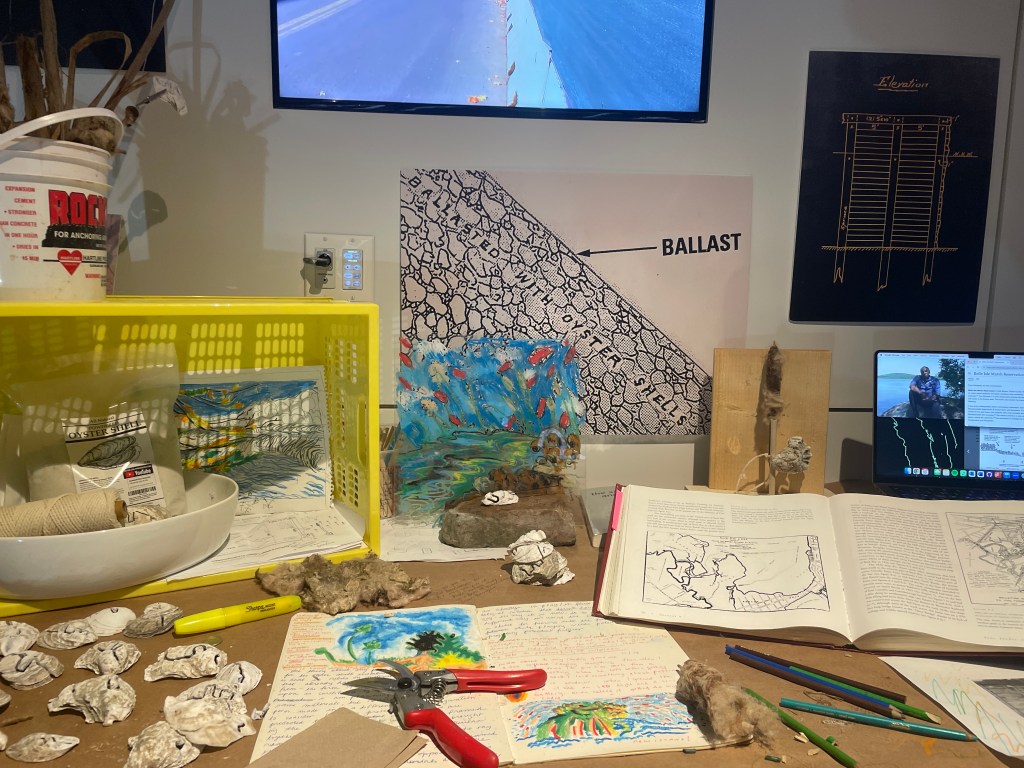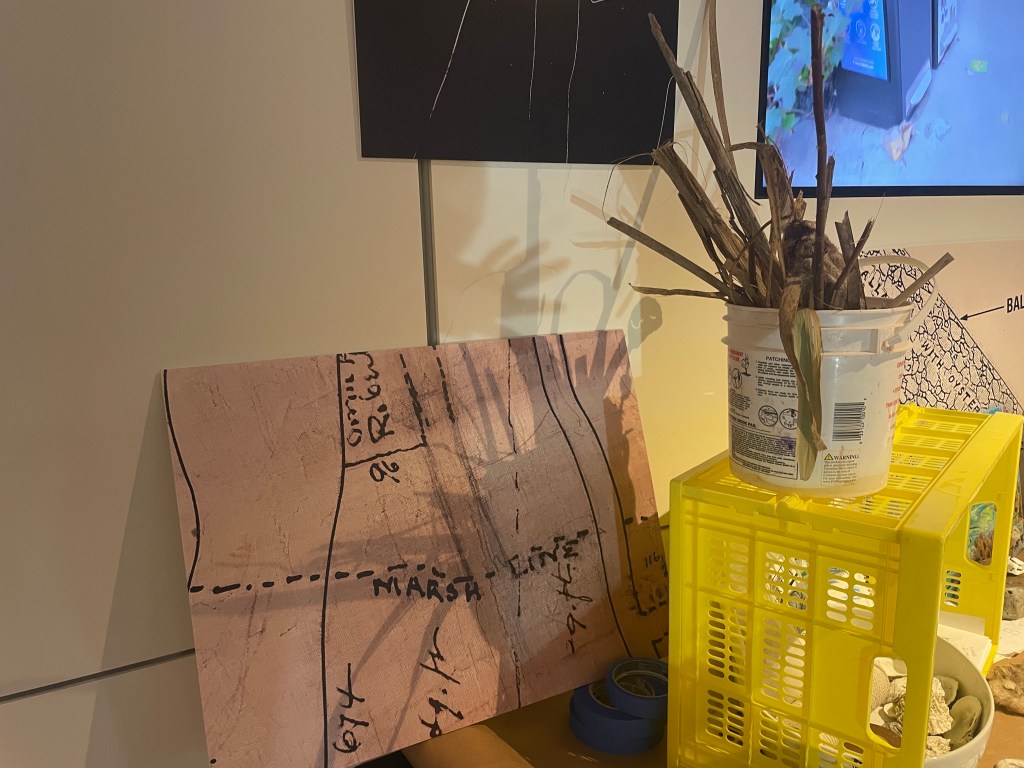 multimedia installation. four channel video, archival images, worktable, borrowed books, sketchbook, carved oyster shells, wax crayon on plexiglass, marsh bricks, construction site bricks, cattail (typha sp.), oyster shell powder, laptop, clippers (gift from sergio)